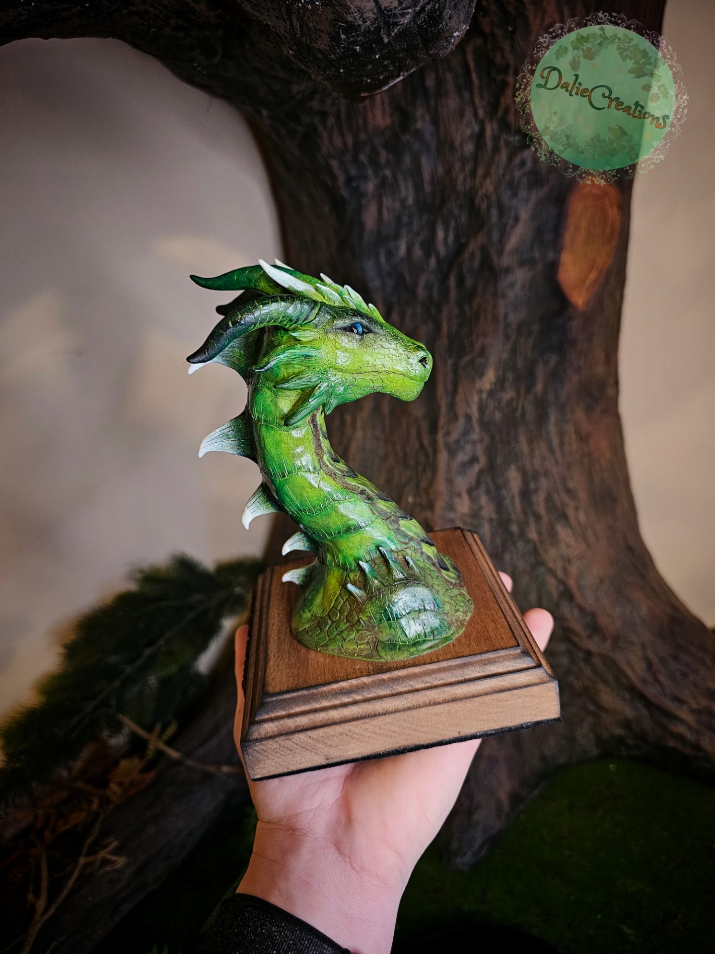 The bust of a Dragon or other magical creature is hand-modeled by me from polymer, with glass cabochons and mounted on a wooden figure. The sculpture is painted with acrylic and treated with varnish. It is a relatively light sculpture.