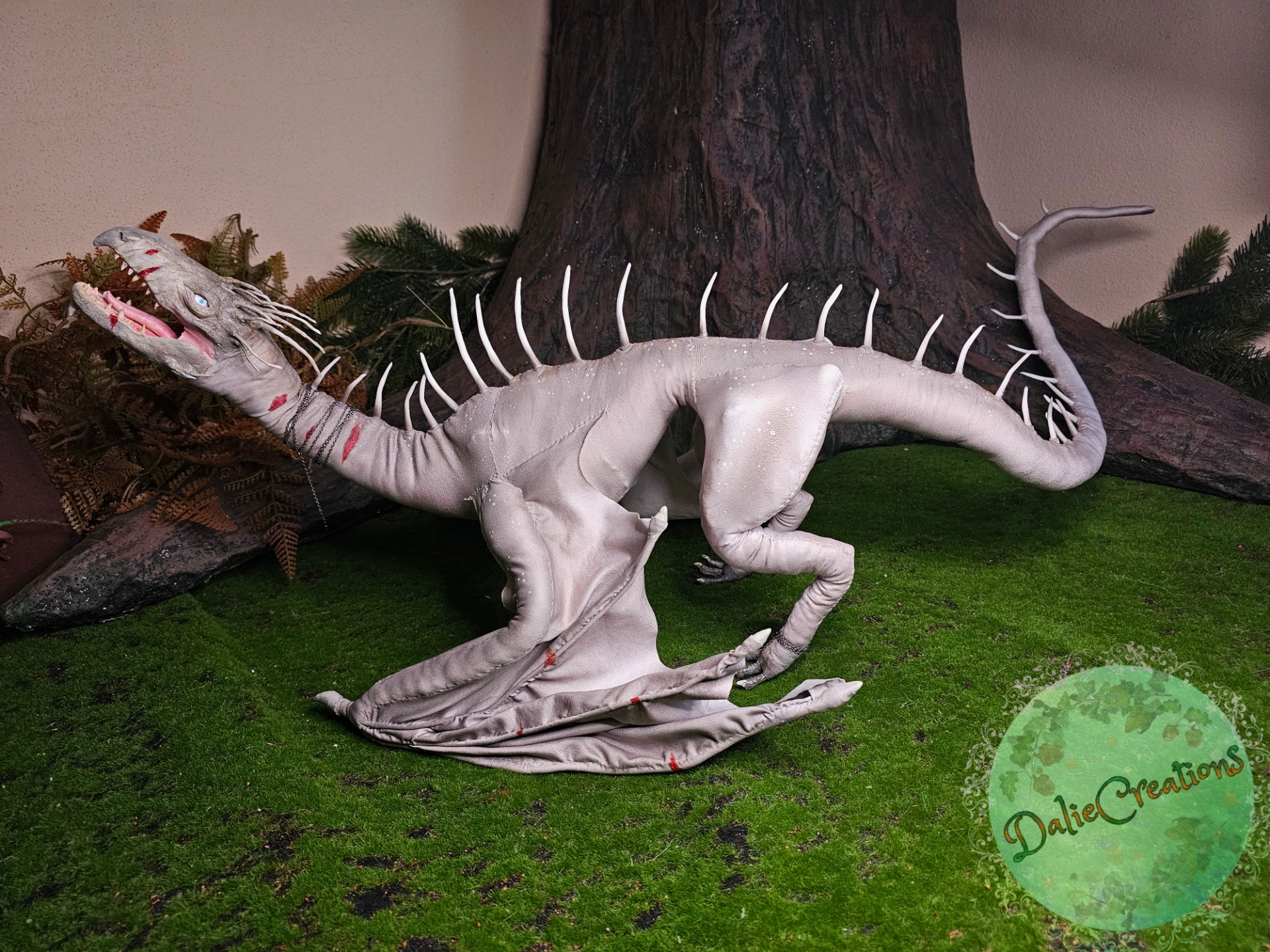 Materiály: luxusná plastová polohovateľná kostra strednej veľkosti v kombinácii s drôtom, polymérová hmota, umelá vata, akrylová farba, lak, sklenené kabošony - oči, evafoam (tŕne aj rebrá sú mäkké).
