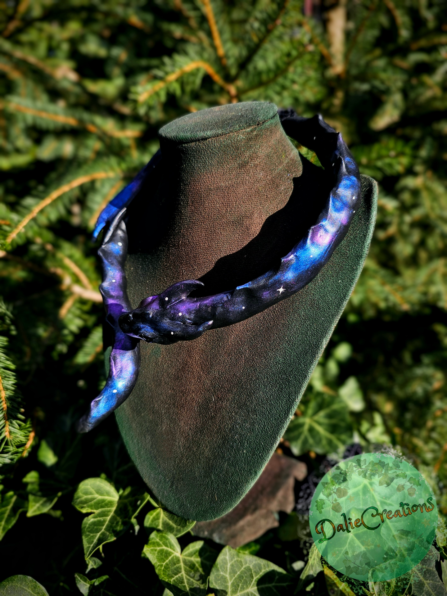 Torque is made by hand from Polymer clay, around the neck at the top pf thorque is an adjustable part filled with wire and it is sewn with plush fabric