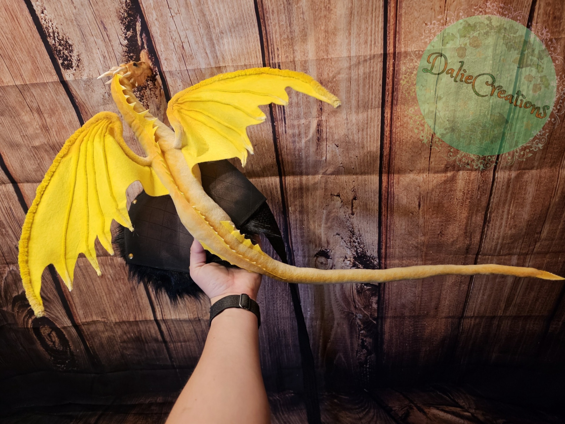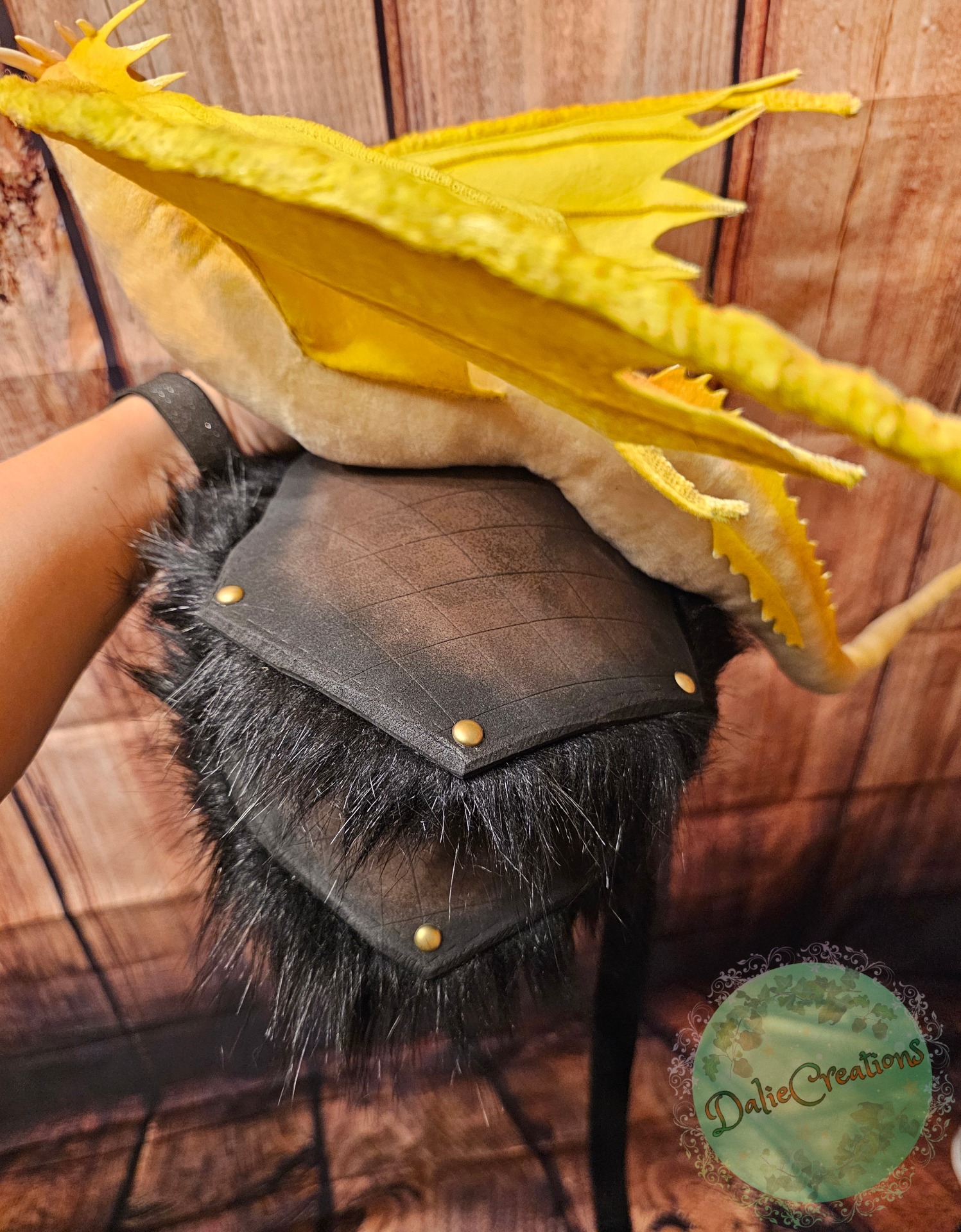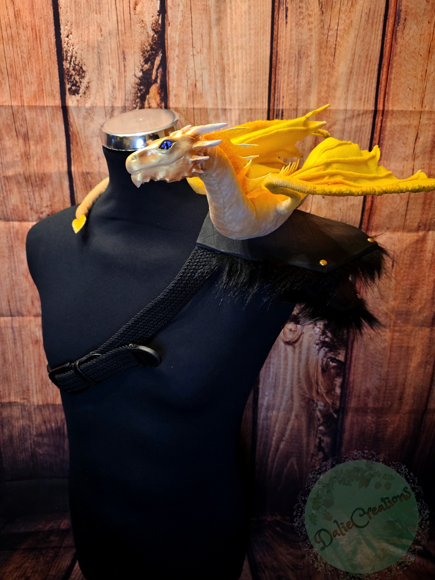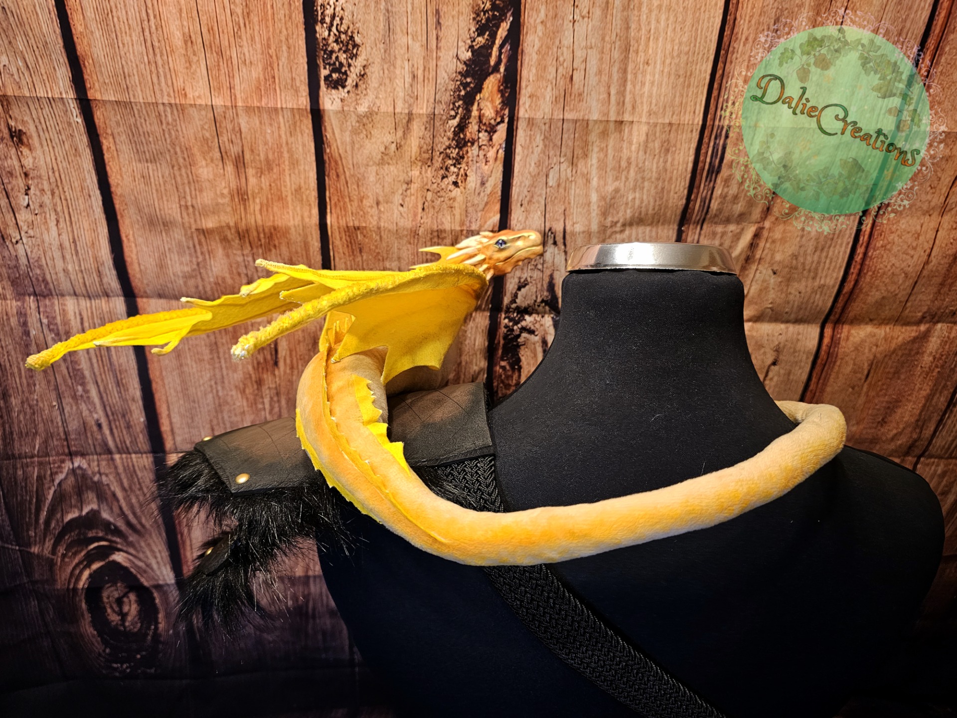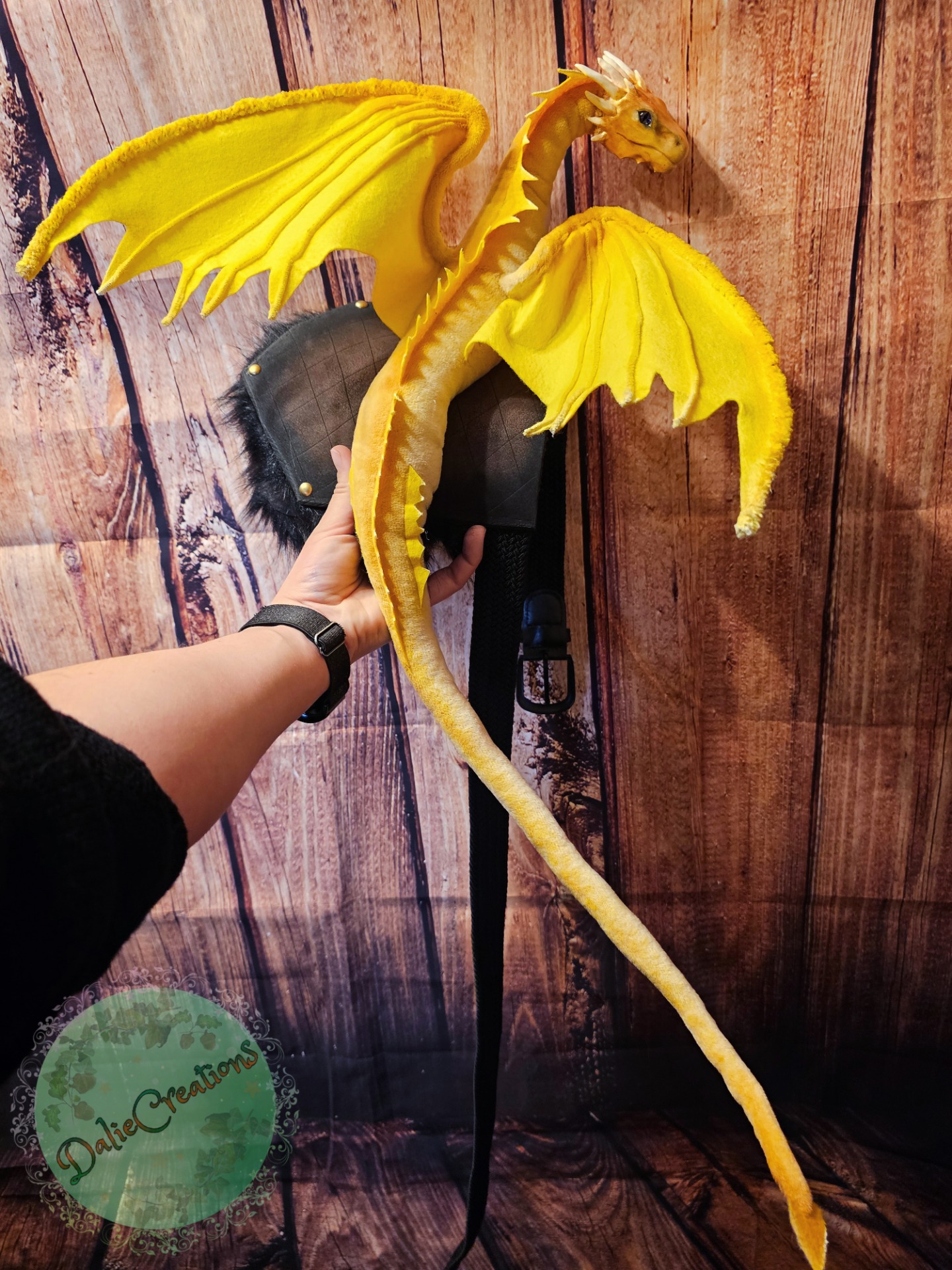 The dragon (the head is hand-modeled from Polymer) has a metal frame with poseable joint skeleton (tail, wings and neck are positionable), The eyes have glass cabochons. The shoulder strap is made of 3mm eva foam material from two layers, painted with acrylic. The inside is lined with black felt. The strap is from a belt. The possibility of adjustable length. Fake fur