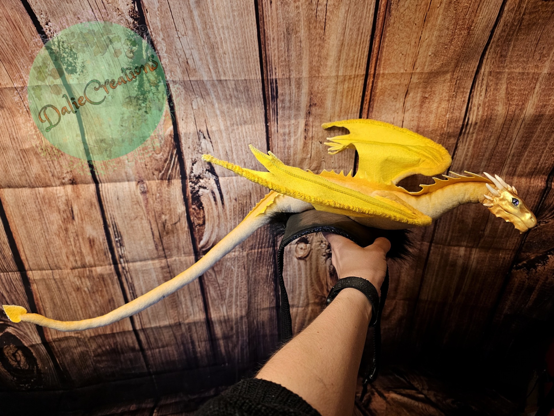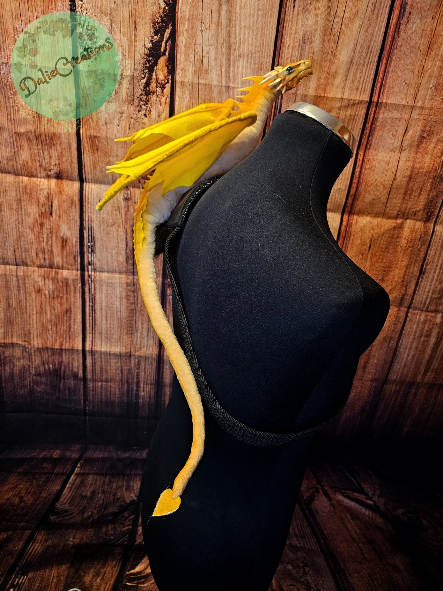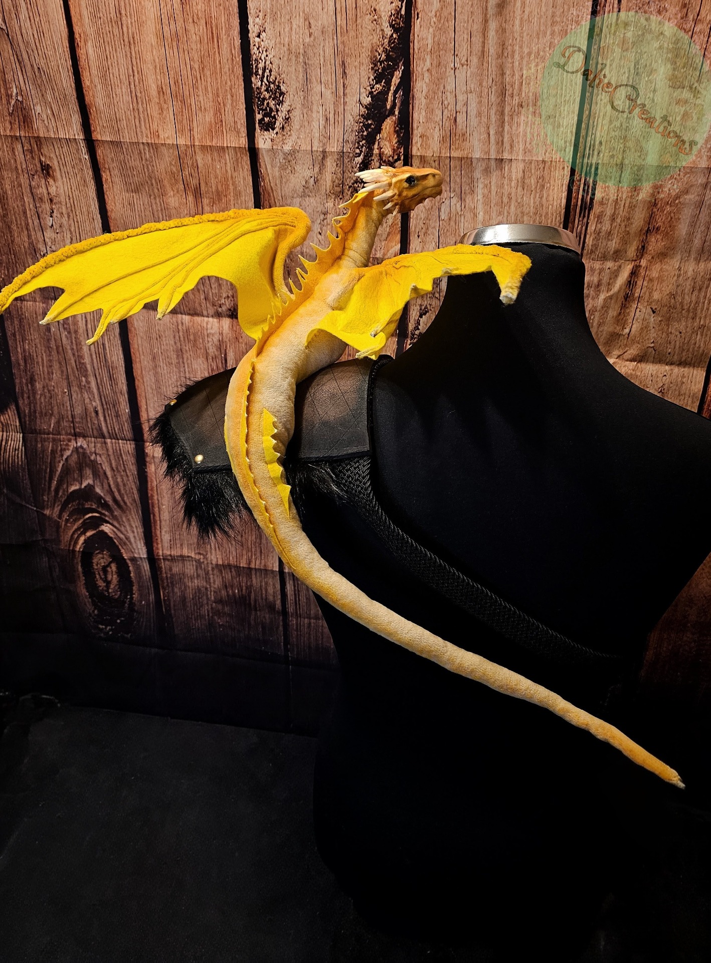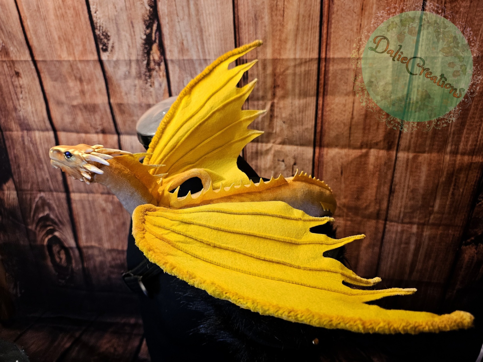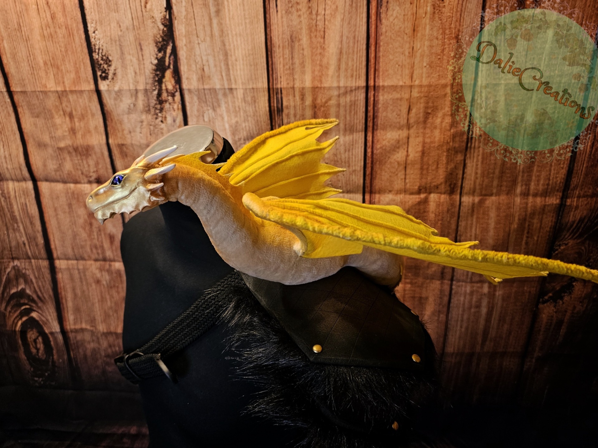 The dragon (the head is hand-modeled from Polymer) has a metal frame with poseable joint skeleton (tail, wings and neck are positionable), The eyes have glass cabochons. The shoulder strap is made of 3mm eva foam material from two layers, painted with acrylic. The inside is lined with black felt. The strap is from a belt. The possibility of adjustable length. Fake fur