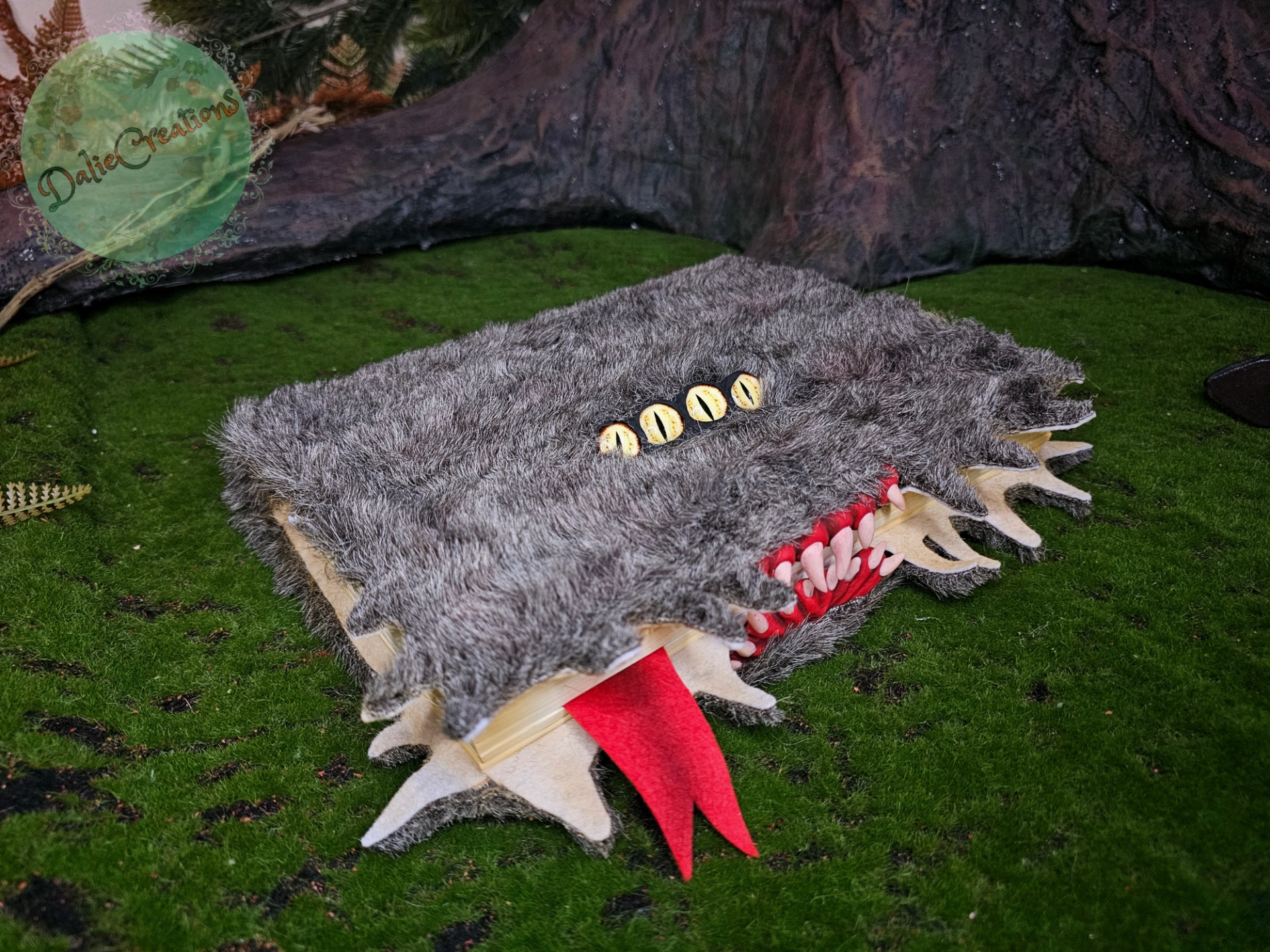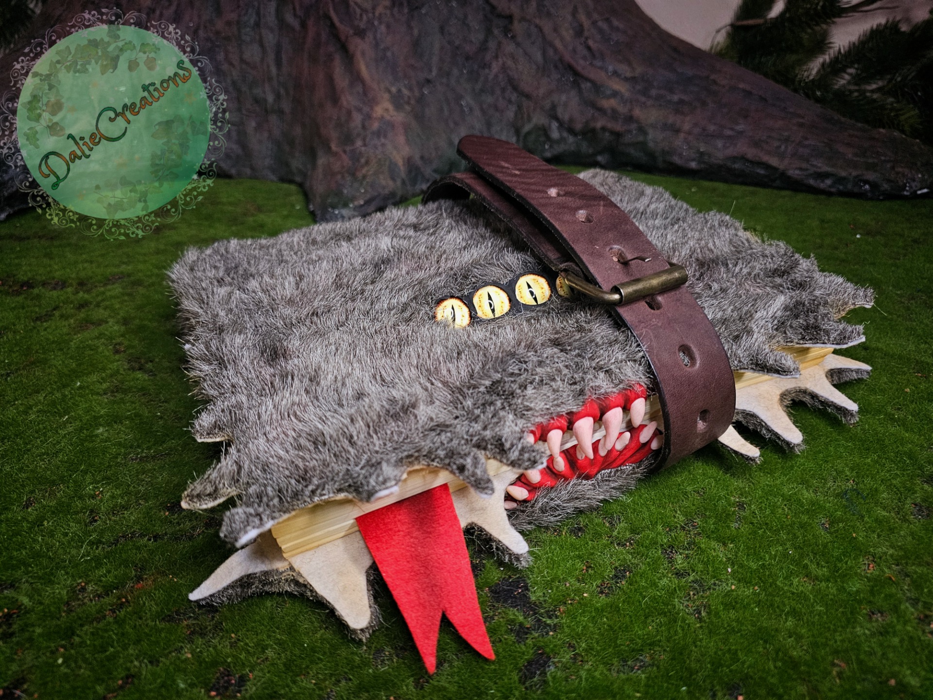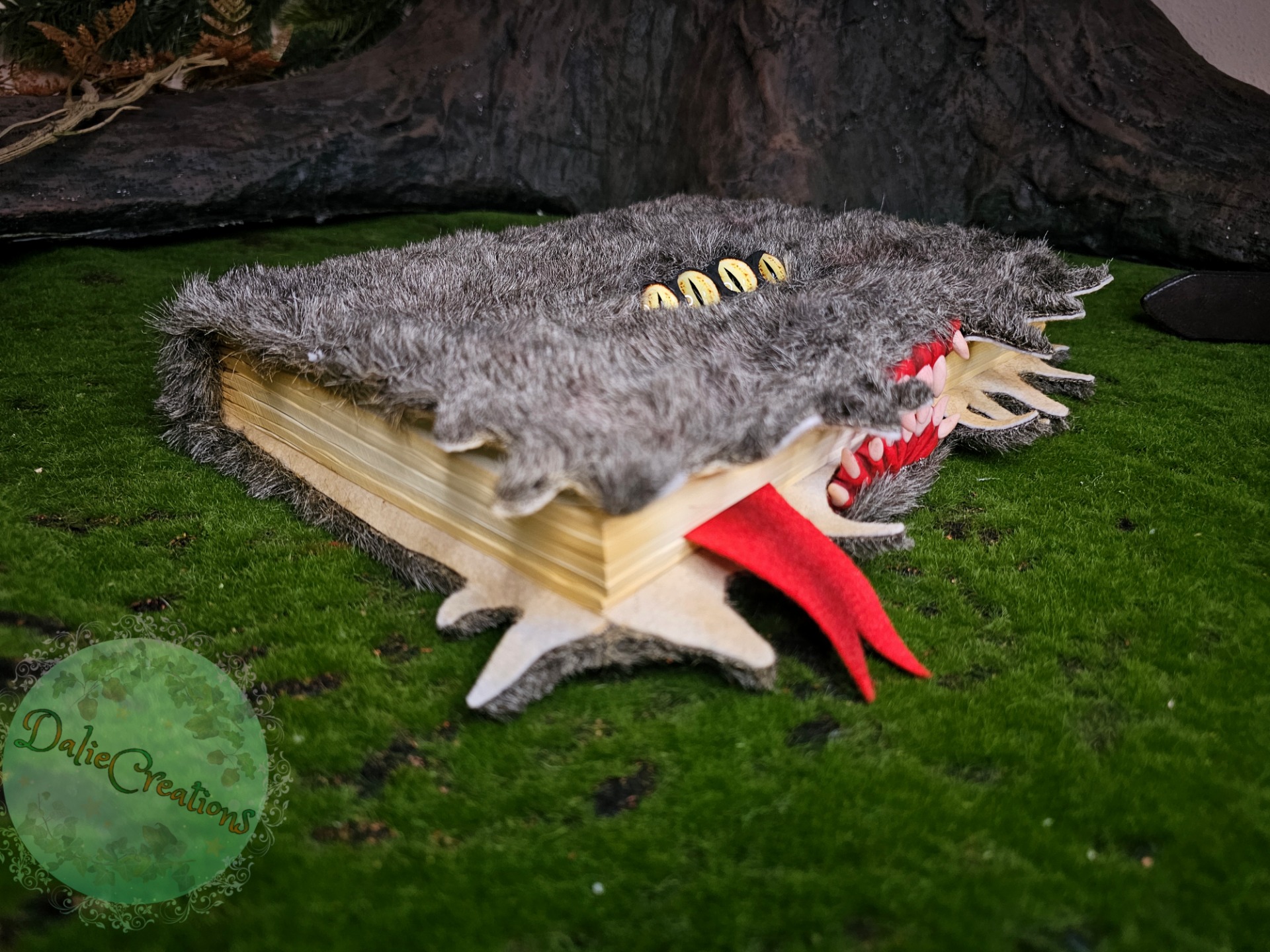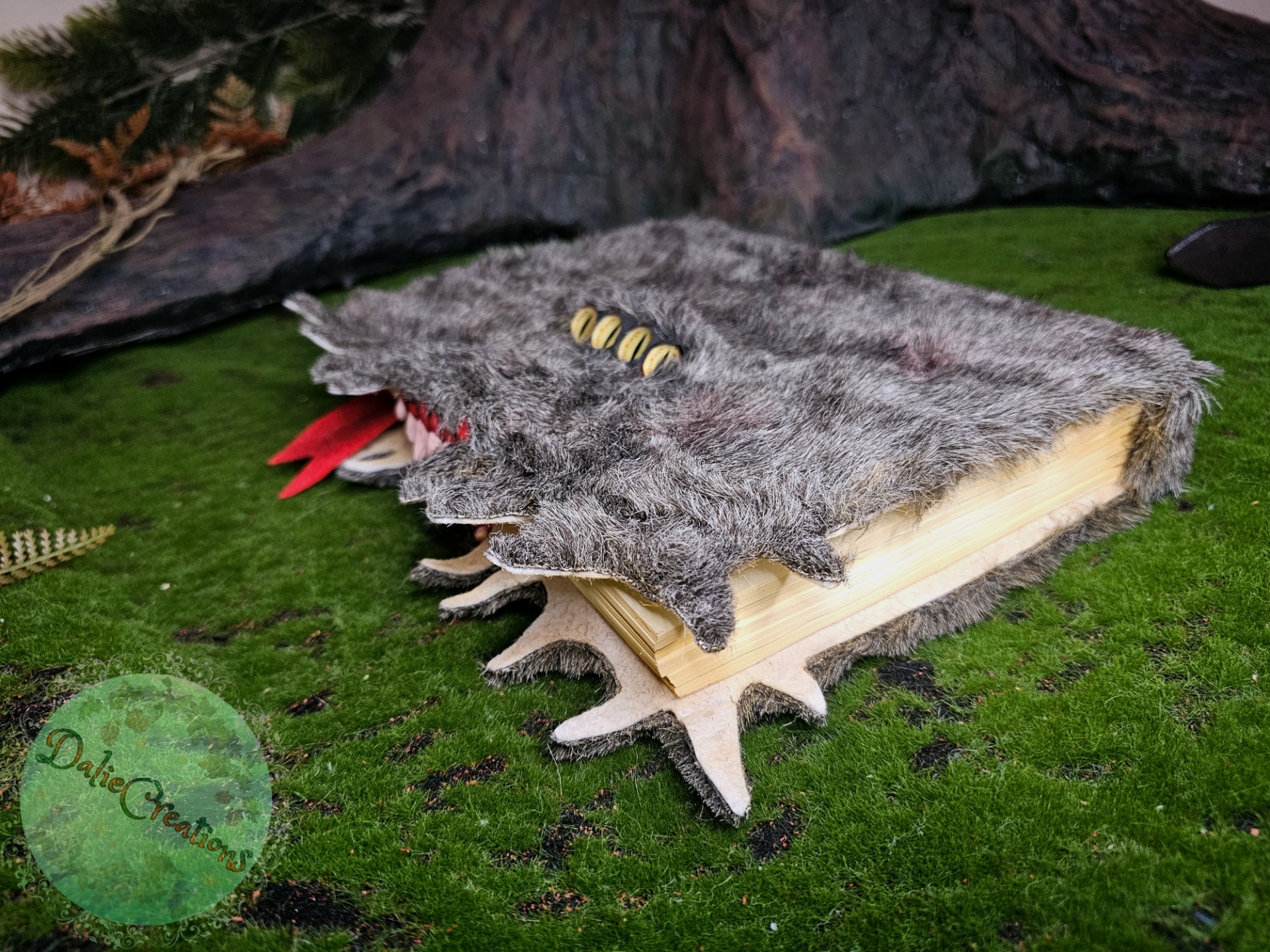 The book was created by wrapping fake fur on recycled notebooks. The eyes are glass cabochons. The belt is made of very old vintage leather. The mouth is made of polymer clay and resin and evafoam. Tongue is from felt