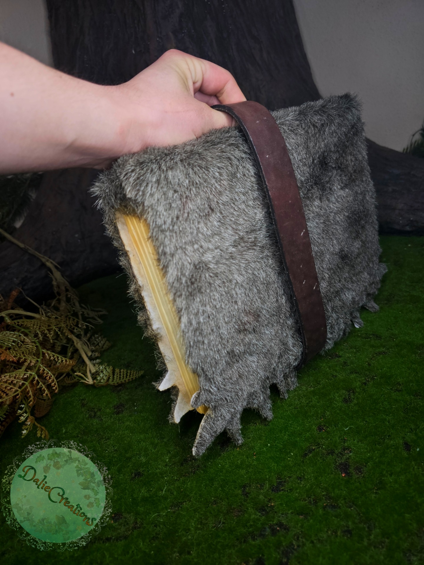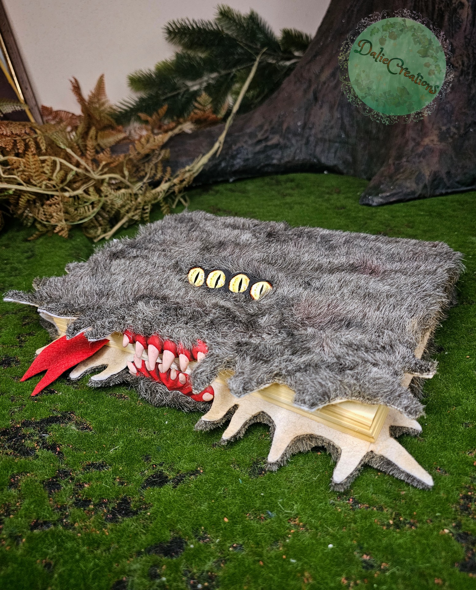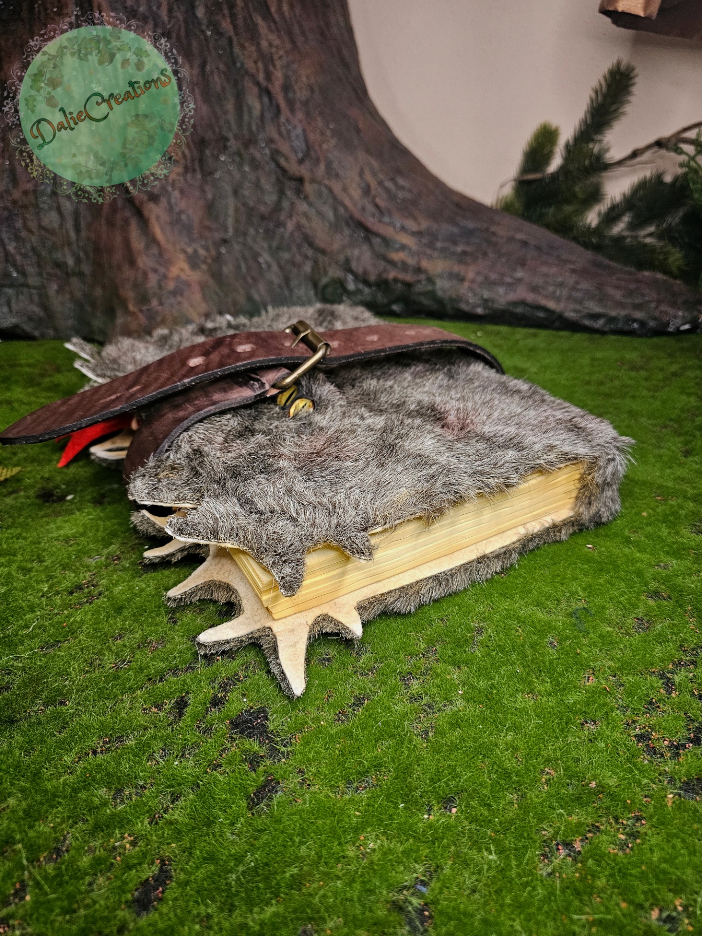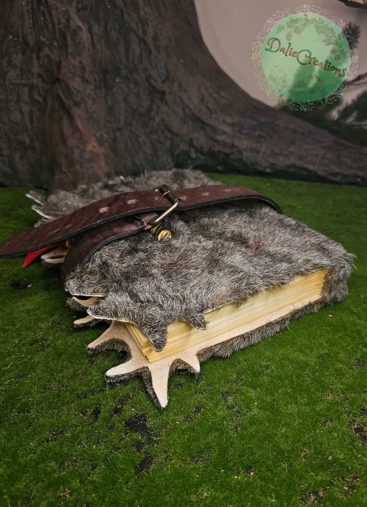 The book was created by wrapping fake fur on recycled notebooks. The eyes are glass cabochons. The belt is made of very old vintage leather. The mouth is made of polymer clay and resin and evafoam. Tongue is from felt