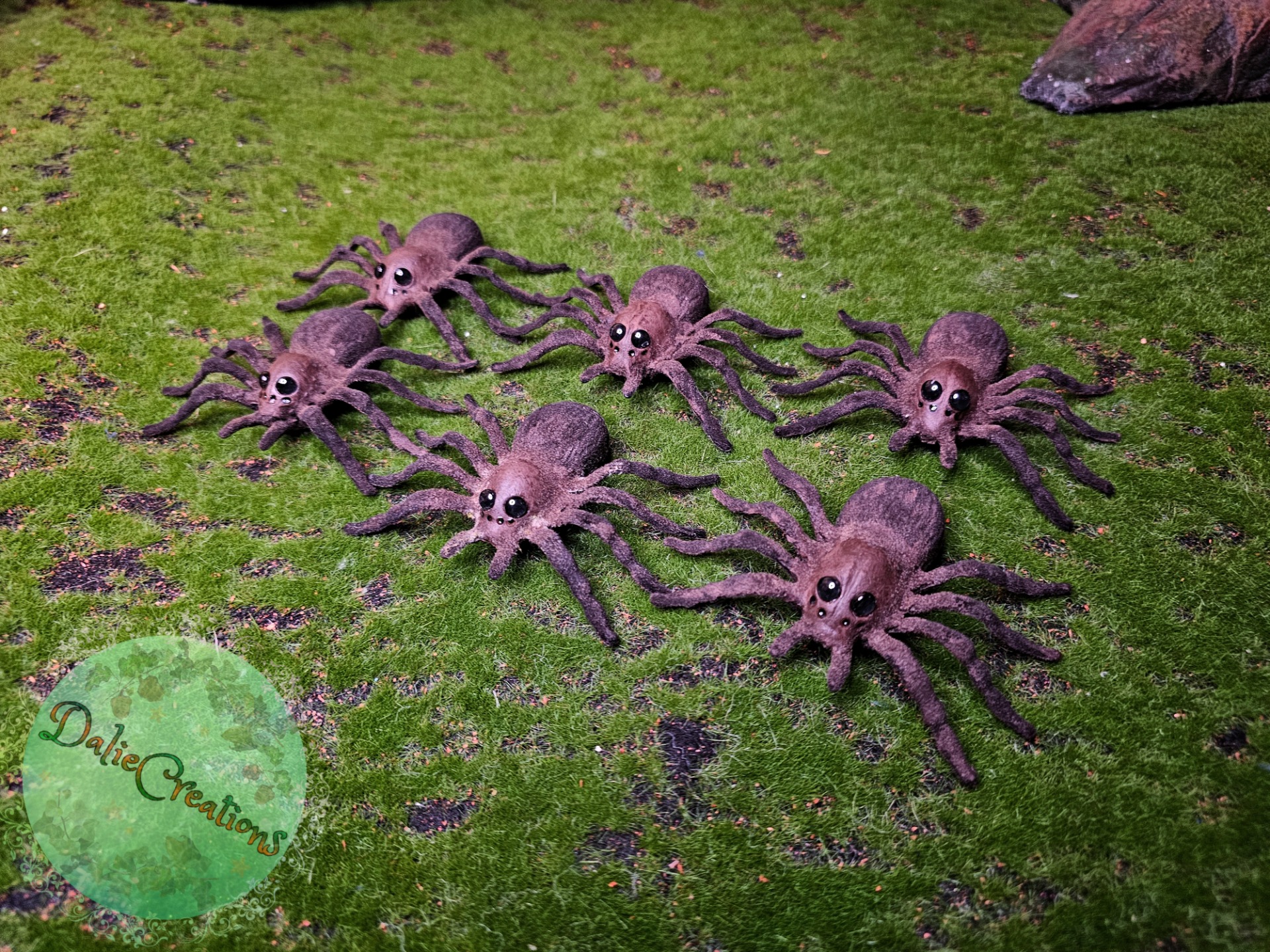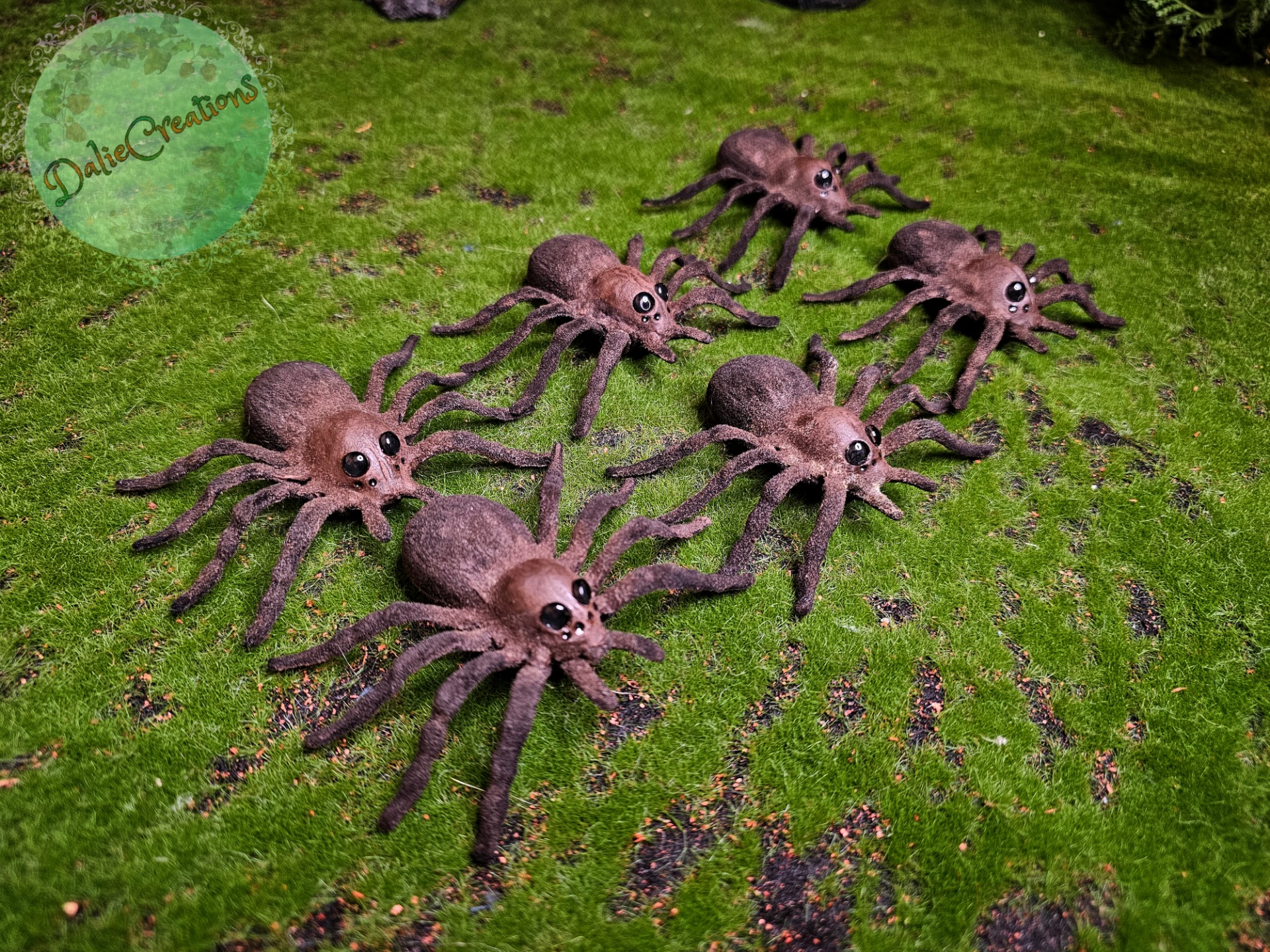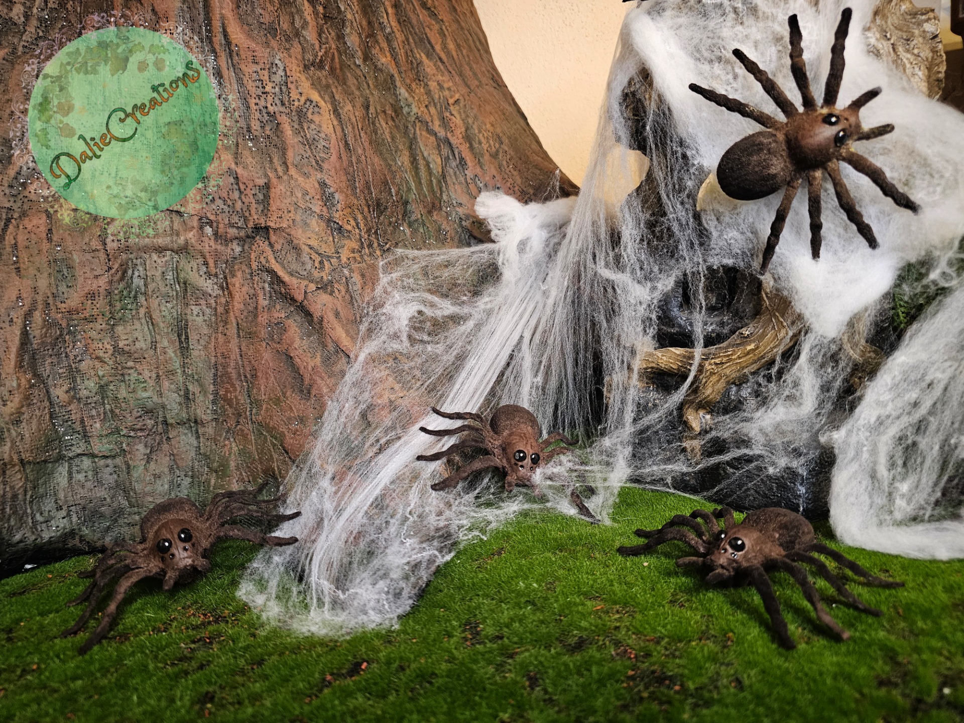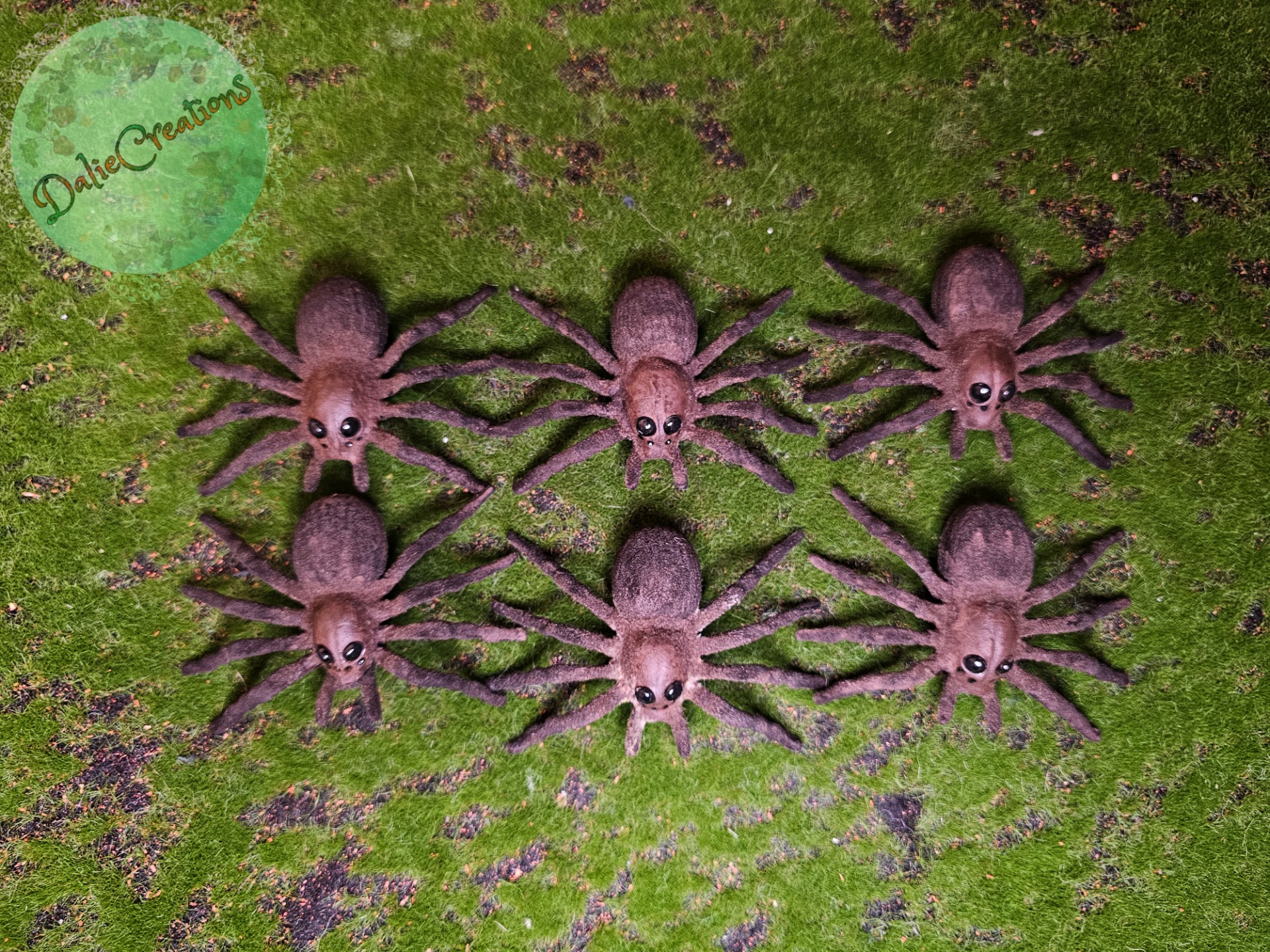 každý jeden pavúk je z plastu tlačený na 3D tlaci, par velkych oci su sklenene kabošony, mensie očká su tvorene lakom a farbou. Chĺpky na tele su hnedé. Pavúky su trochu elasticke no neohybatelne. Pavukov je v ponuke 6 kusov. A nebudu sa dat vytvarat na objednávku. Kazdy z pavúkov dostane na cestu aj balíček pavuciny, aby ste mu mohli spravit pohodlný domcek ked ku vam príde.