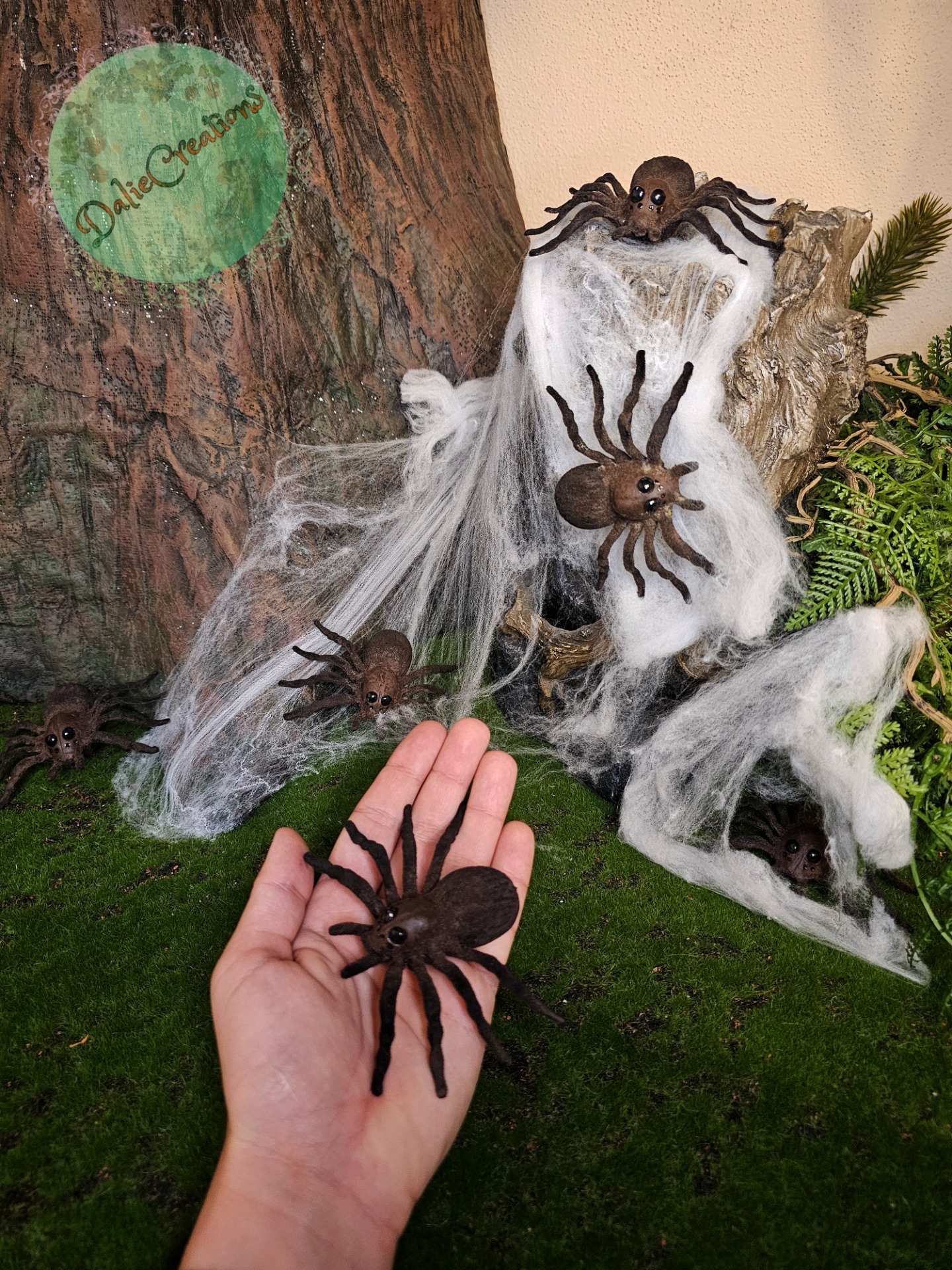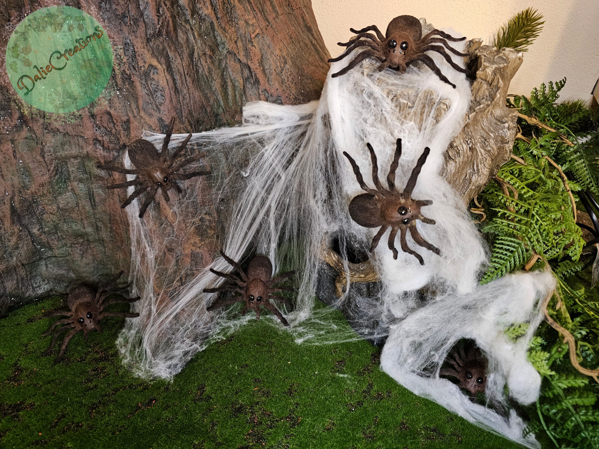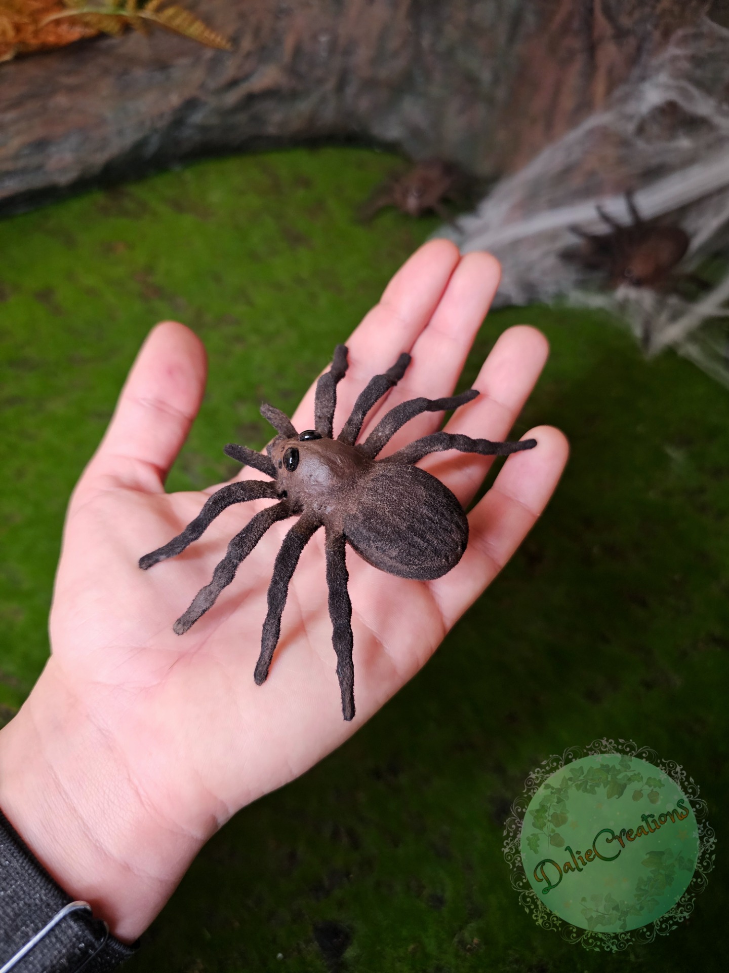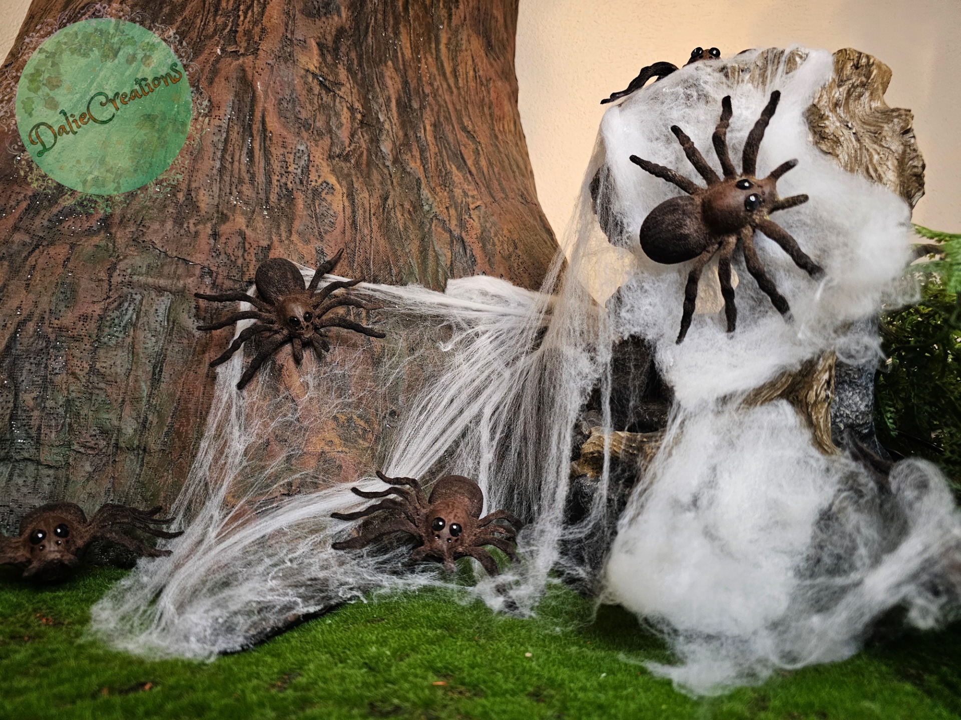 každý jeden pavúk je z plastu tlačený na 3D tlaci, par velkych oci su sklenene kabošony, mensie očká su tvorene lakom a farbou. Chĺpky na tele su hnedé. Pavúky su trochu elasticke no neohybatelne. Pavukov je v ponuke 6 kusov. A nebudu sa dat vytvarat na objednávku. Kazdy z pavúkov dostane na cestu aj balíček pavuciny, aby ste mu mohli spravit pohodlný domcek ked ku vam príde.